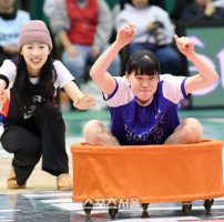 BNK썸 이소희(오른쪽)가 22일 부천체육관에서 열린 2024-2025 여자프로농구 올스타전에서 팬과 함께 게임을 하고 있다. 2024. 12. 22.부천 | 박진업 기자 upandup@sportsseoul.com